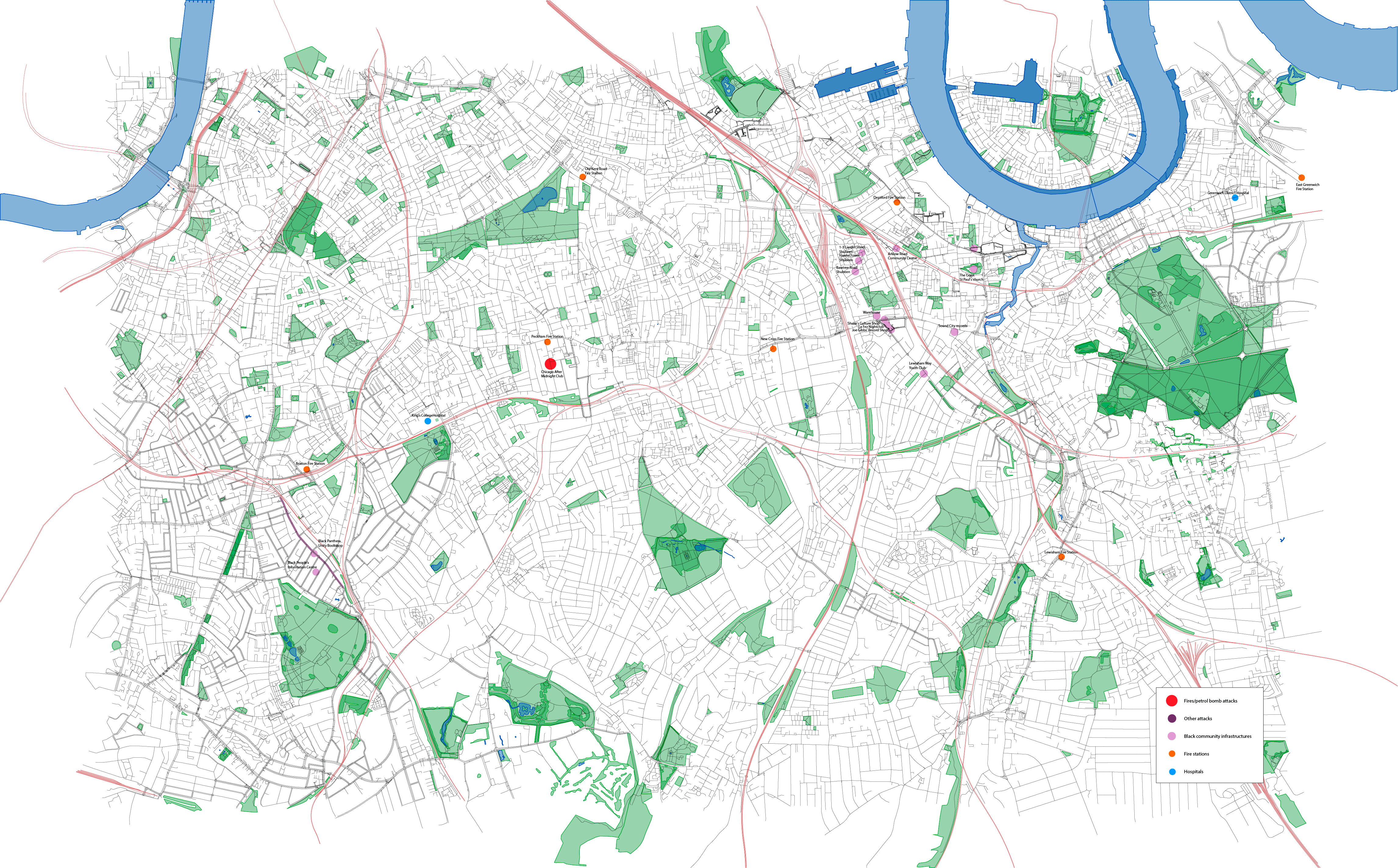 Through our research, it becomes clear that the Massacre was not an isolated and irregular tragedy, but part of a pattern of racial violence that characterises the political and social landscape of Britain across the 1970 and 1980s. This pattern of arson attacks on Black community spaces preceding the New Cross Massacre, such as the Black Panthers Unity Bookshop in 1974, the Moonshot Club in 1977, and the Albany Centre in 1978, demonstrates recurring destructive acts of racial violence.4 Targeting Black community spaces created an environment where communal celebrations were forced into the private sphere, occurring in homes. Just six months after the Massacre, Doreen Khan and her three children were murdered in their home in Walthamstow from a petrol bomb attack.5 By plotting the frequency and geographies of these arson attacks, the Massacre is shown in the context of a racist environment, revealing the plausibility of the fire as a racist attack.